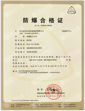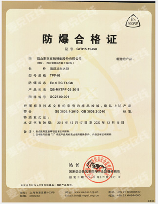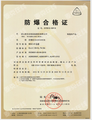 我公司于2015年12月24日正式取得由國(guó)家級(jí)儀器儀表防爆安全監(jiān)督檢驗(yàn)站頒發(fā)的防爆合格證,包括《防爆在線(xiàn)連續(xù)分析儀》防爆證、《溫壓流變送器》防爆證、《防爆電加熱器》防爆證。